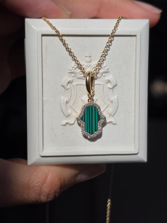 14k Malachite and Diamond Hamsa Pendant (NO CHAIN)