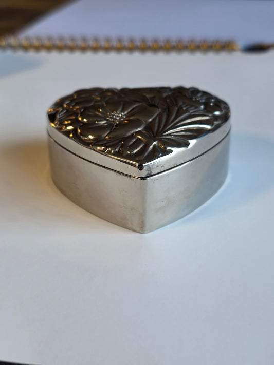 International Silver Company Heart Shaped Silver Velvet Lined Jewelry Box Floral