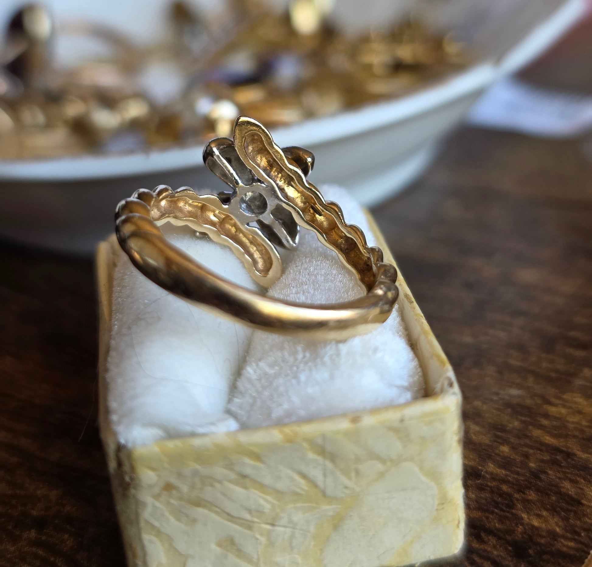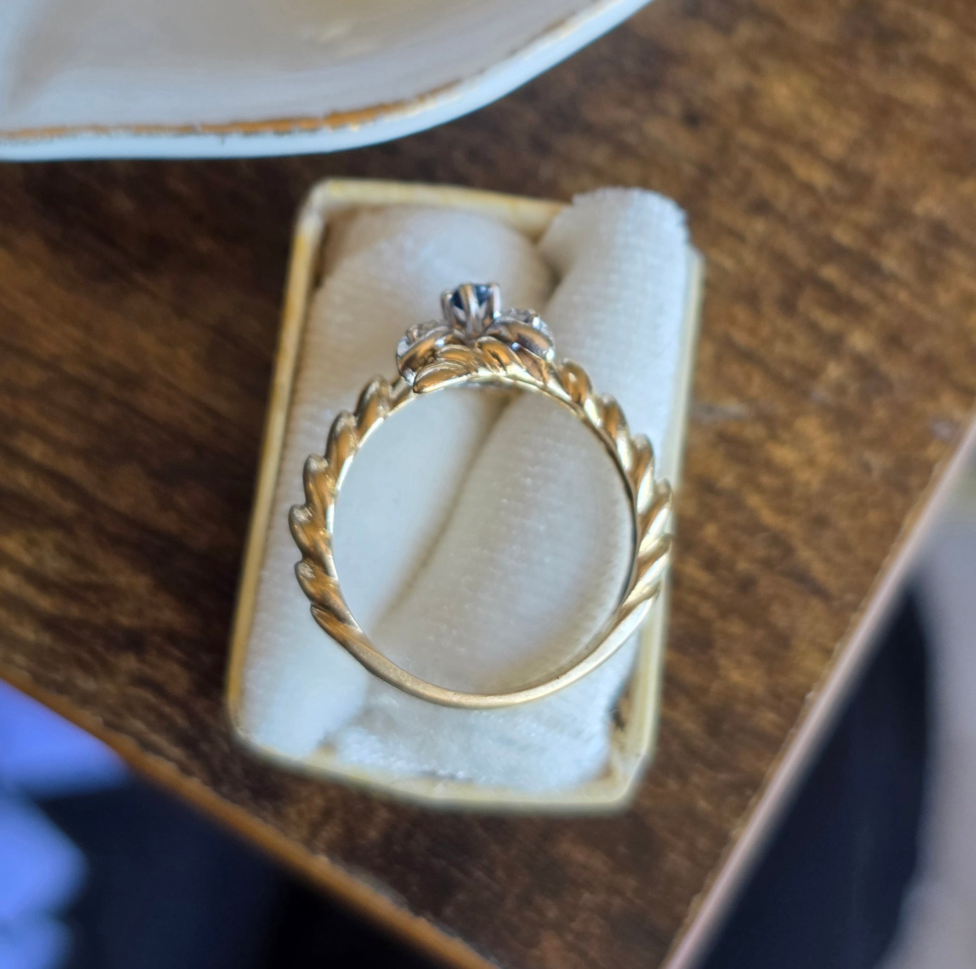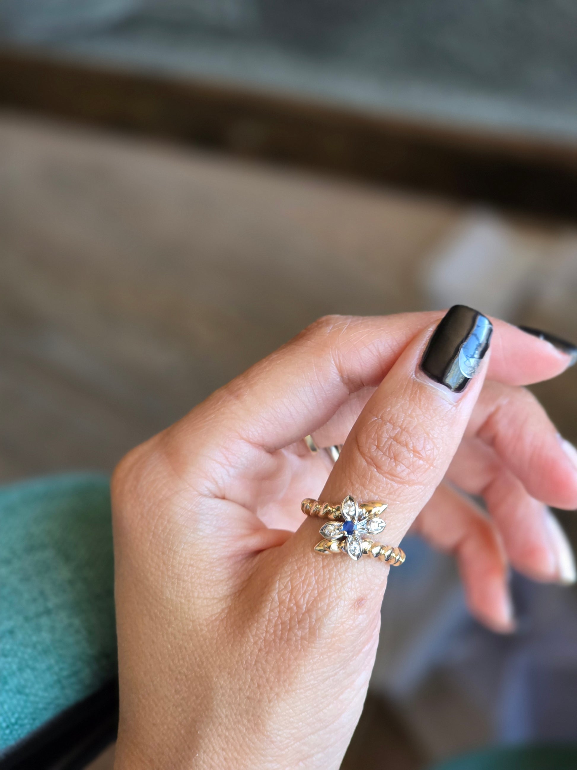 Beautiful 14k Two Toned Bypass Flower Sapphire and Diamond Ring Size 6.5