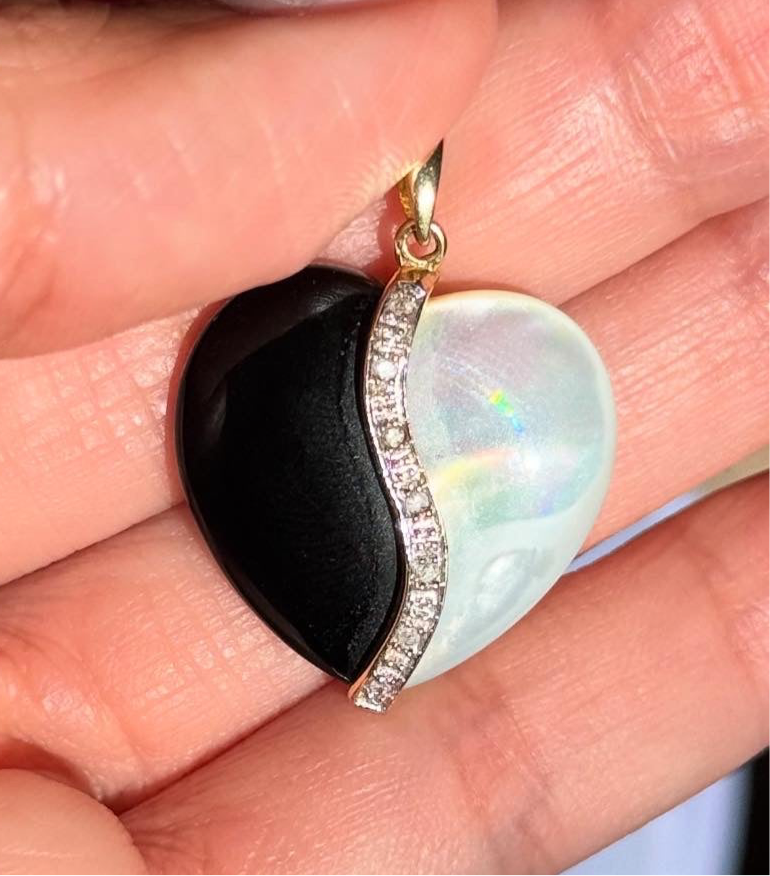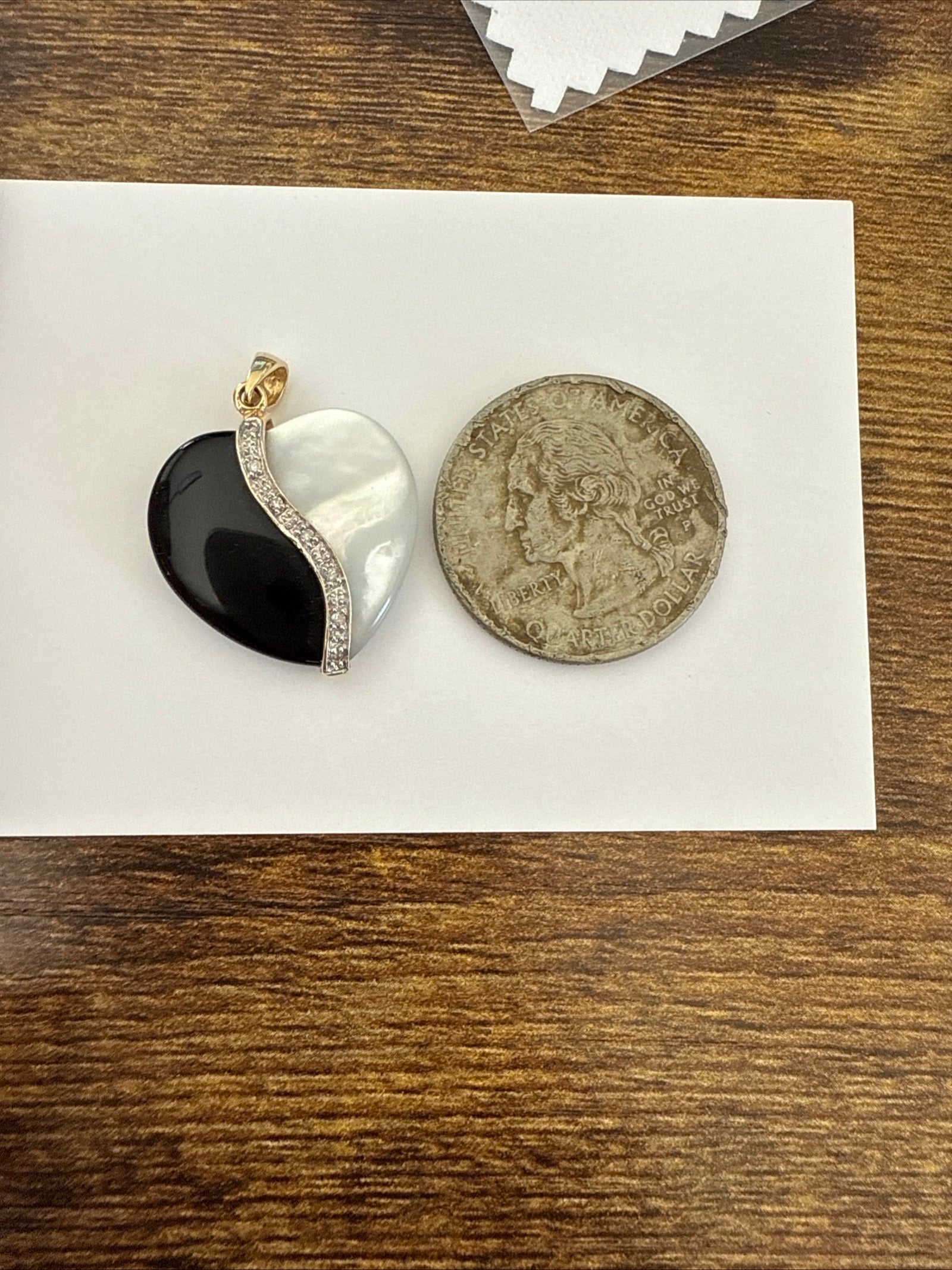 Beautiful Onyx and MOP Yin Yang Heart 14k Gold Diamond Accent Pendant