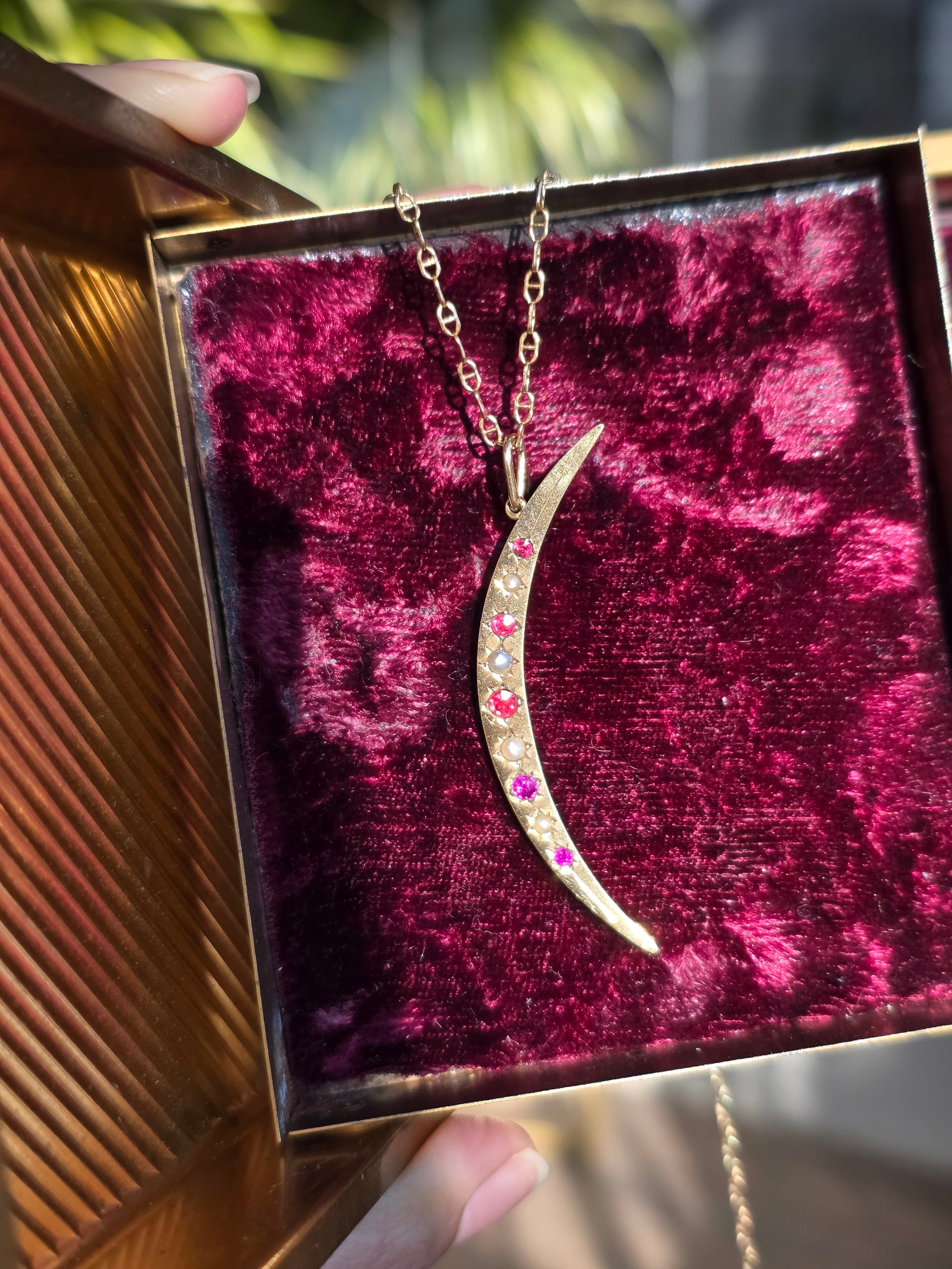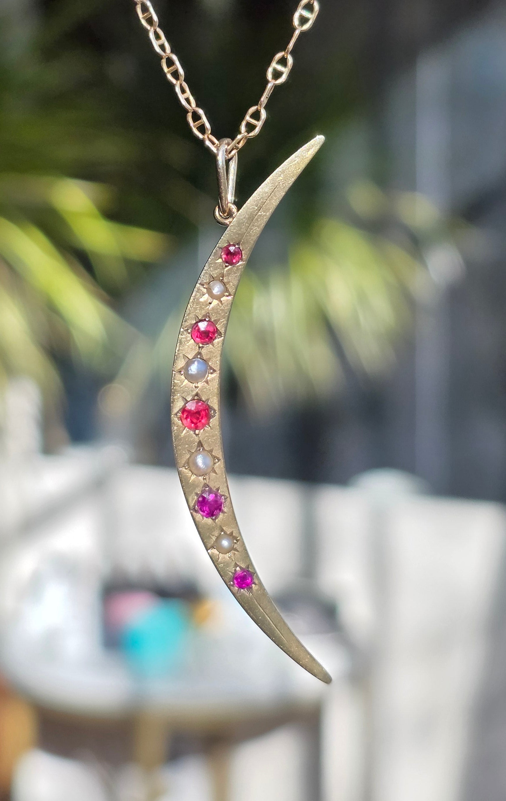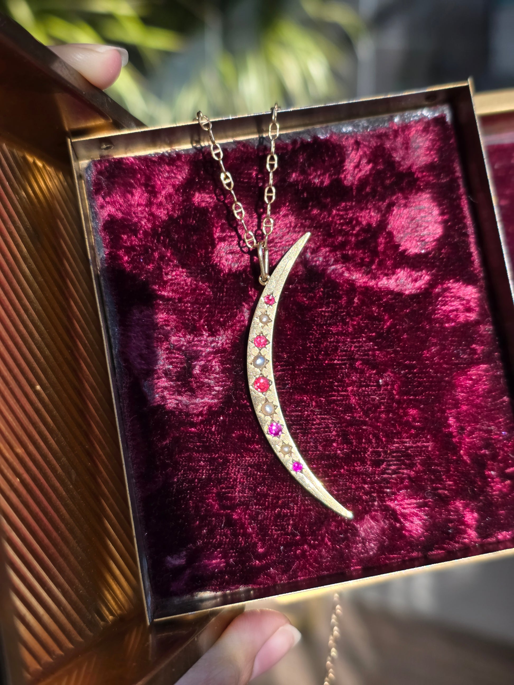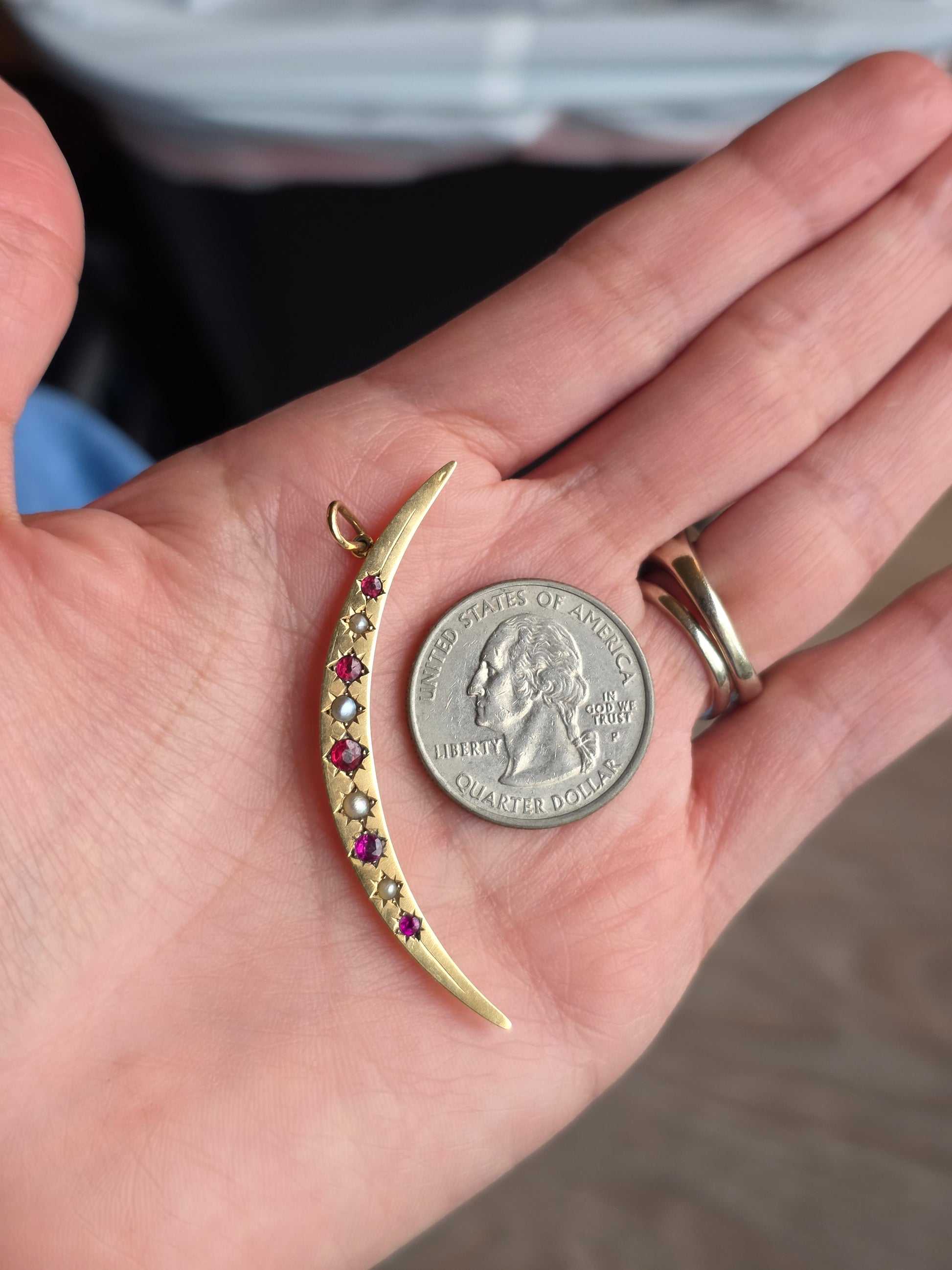 Beautiful Vintage 9k Gold Pearl & Gemstone Crescent Moon Pendant (NO CHAIN)