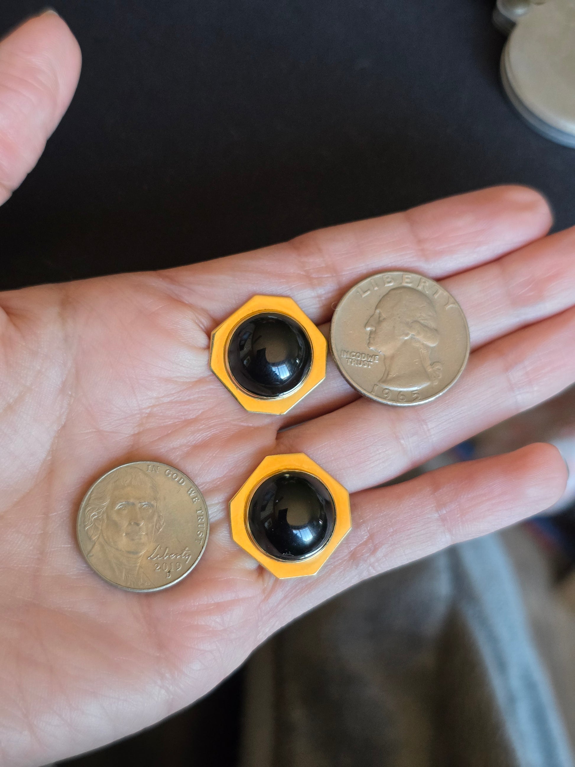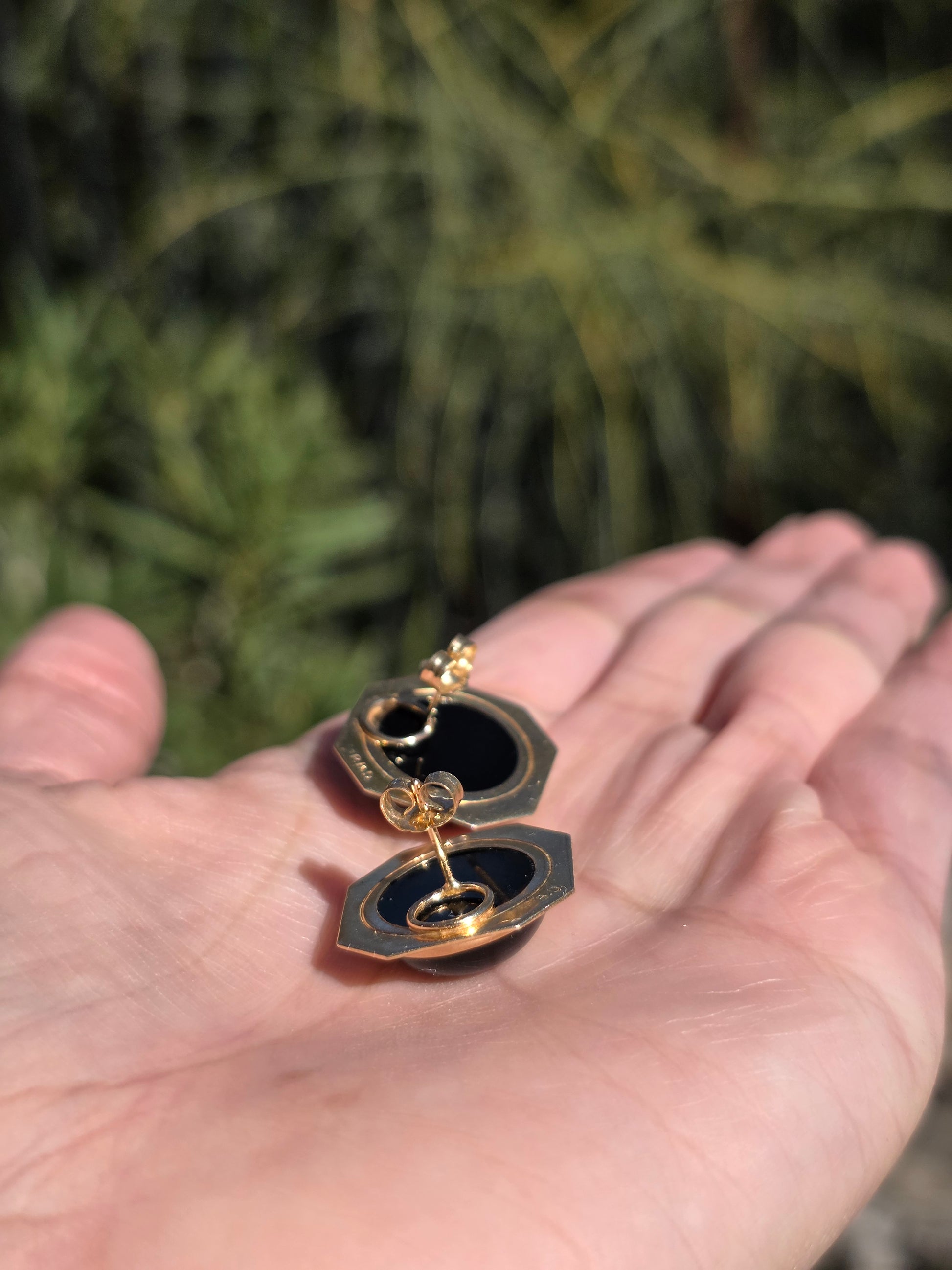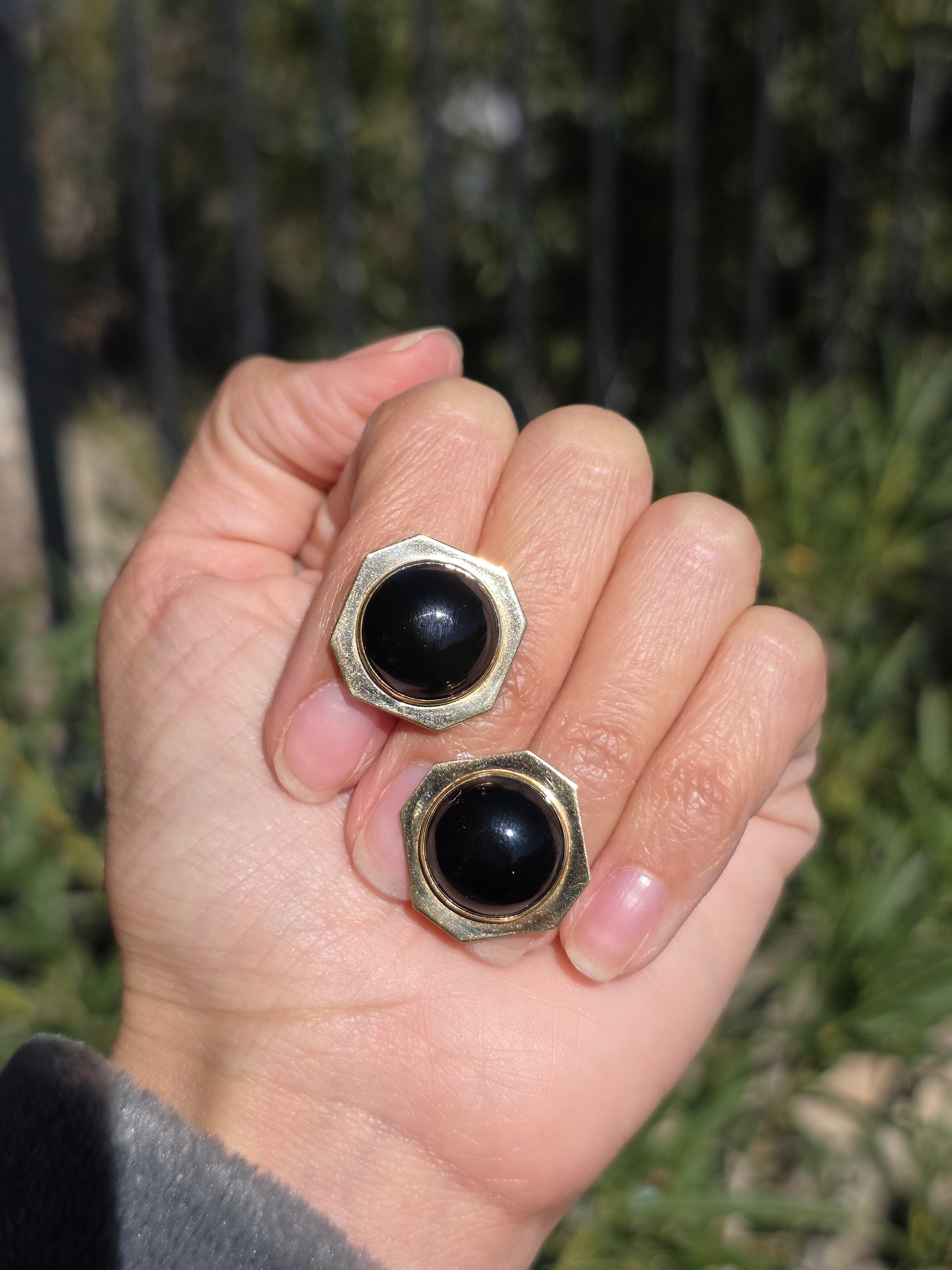 Geometric 14k Gold Onyx Cabochon Statement Button Earrings