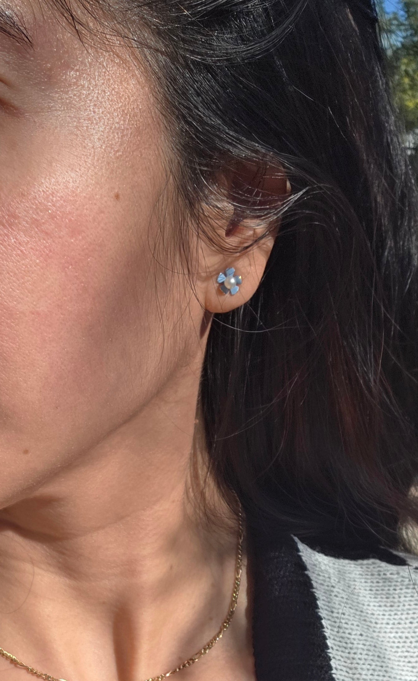 Precious 14k Blue Enamel & Pearl Dainty Flower Stud Earrings