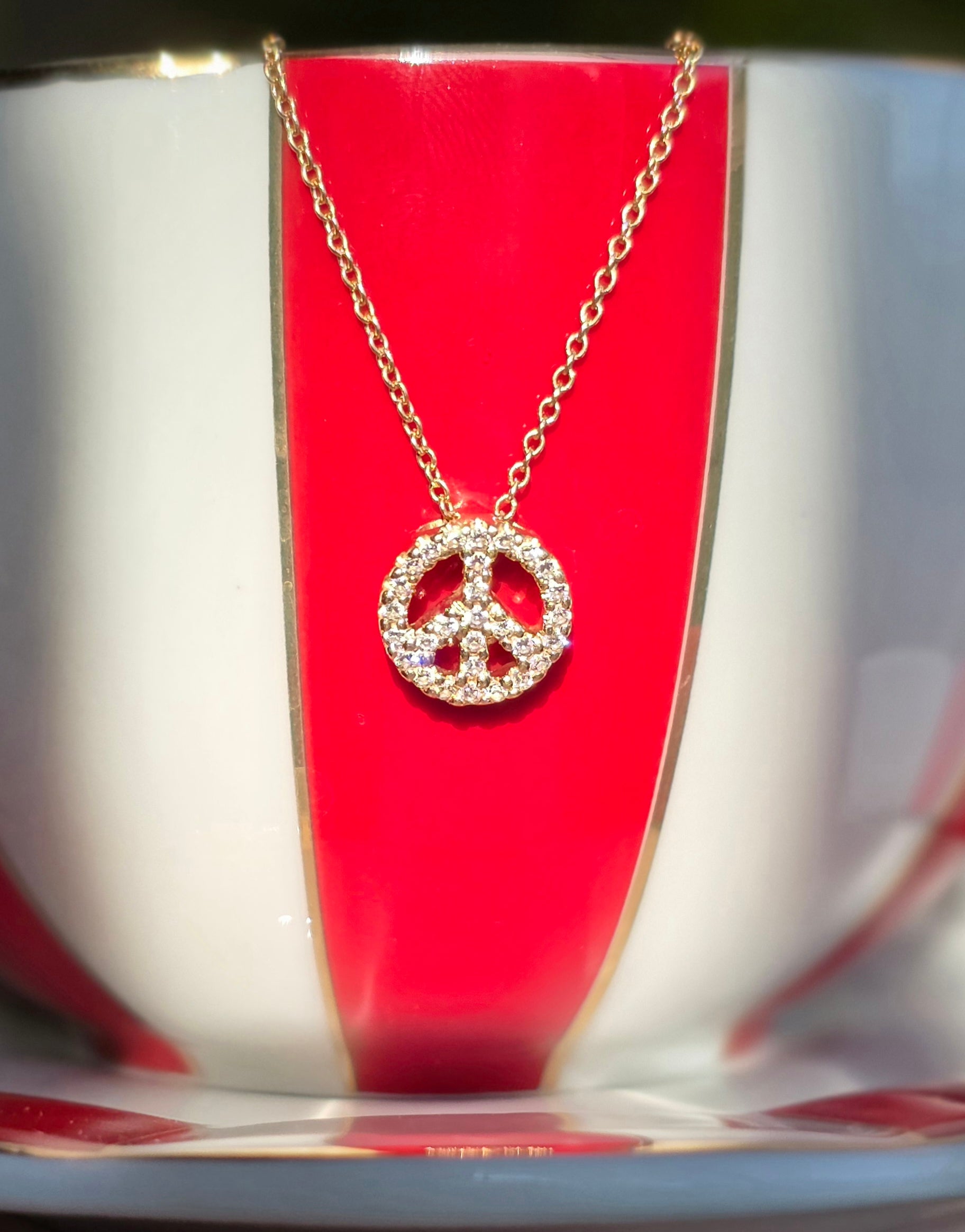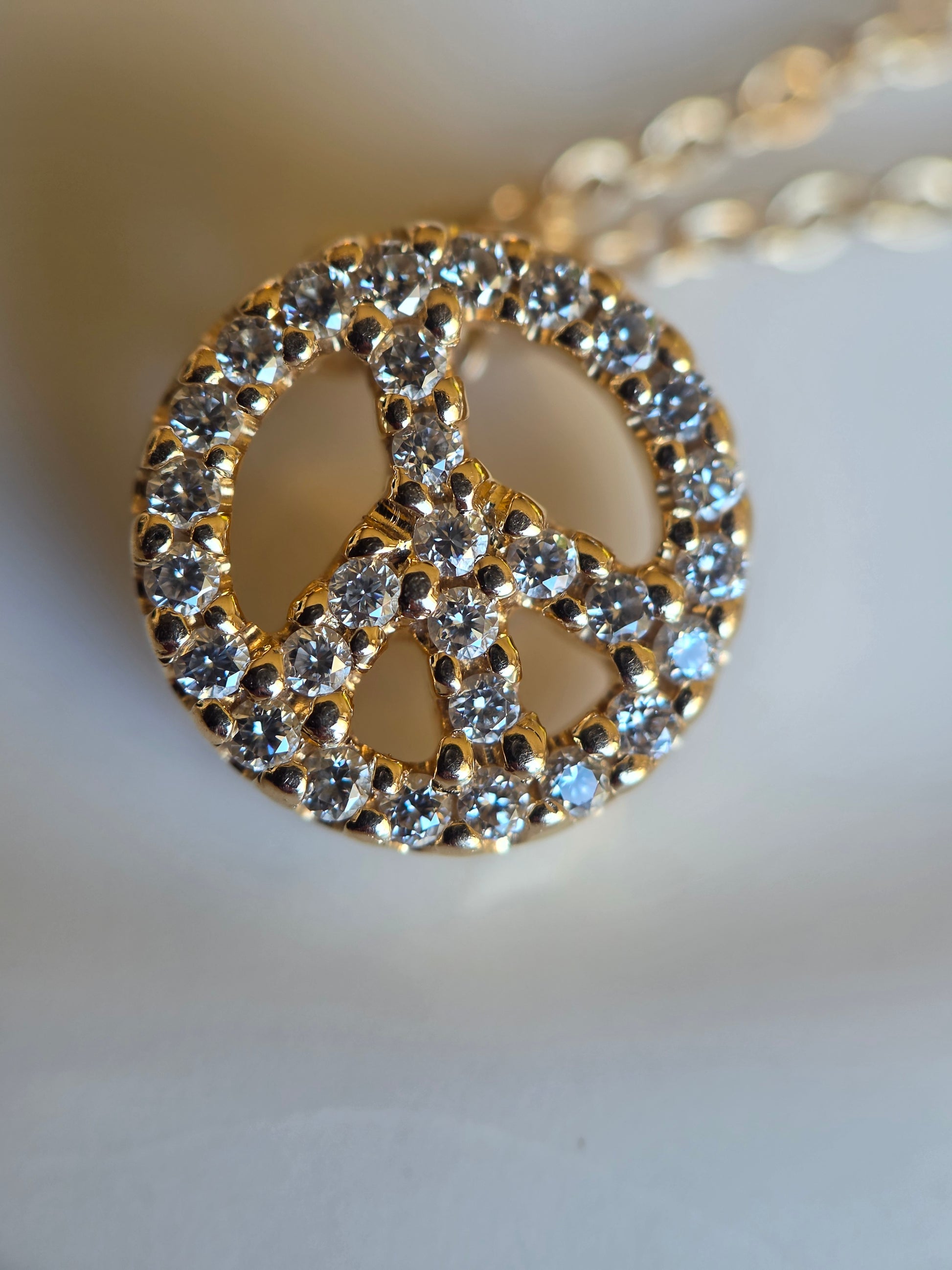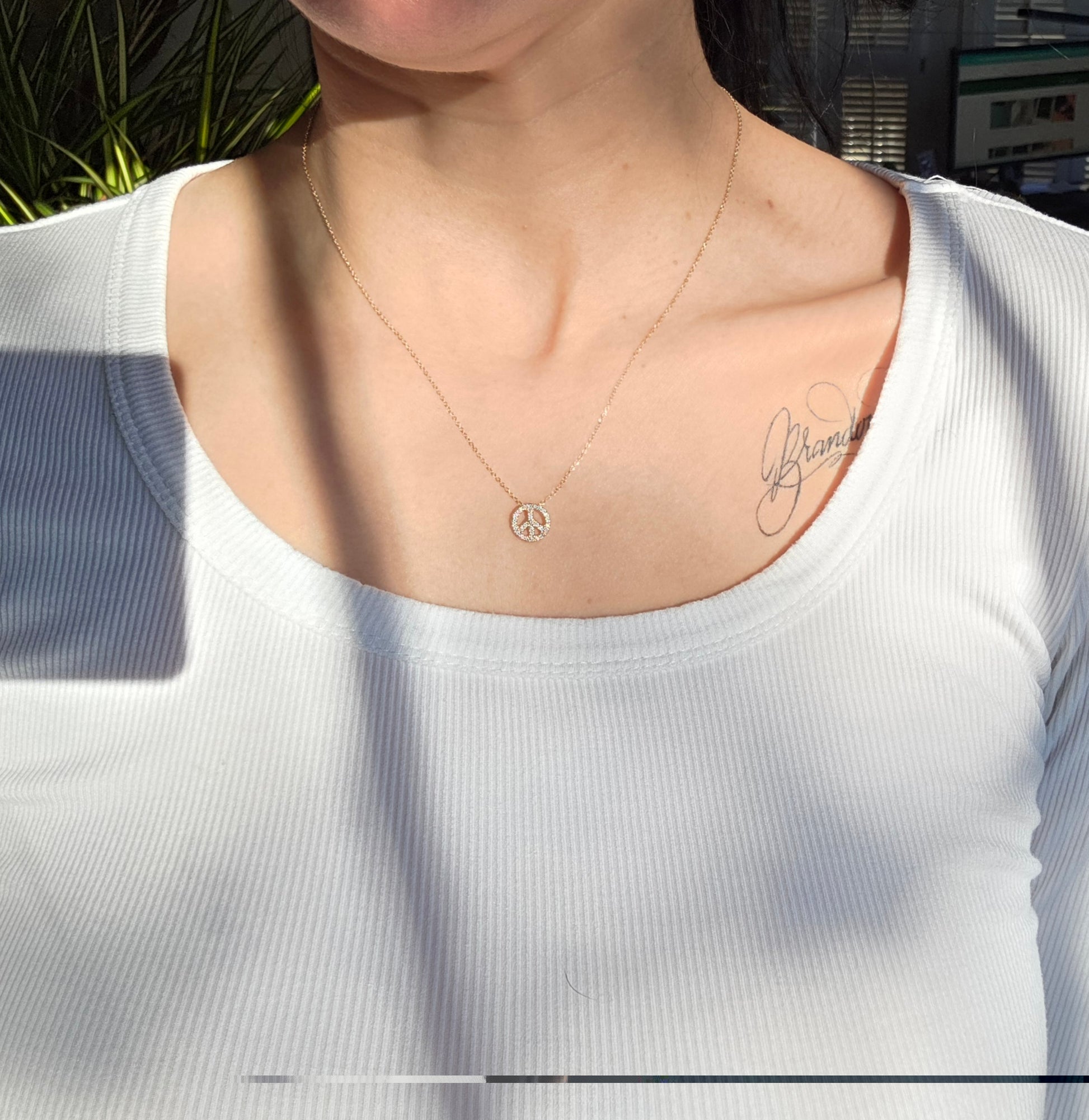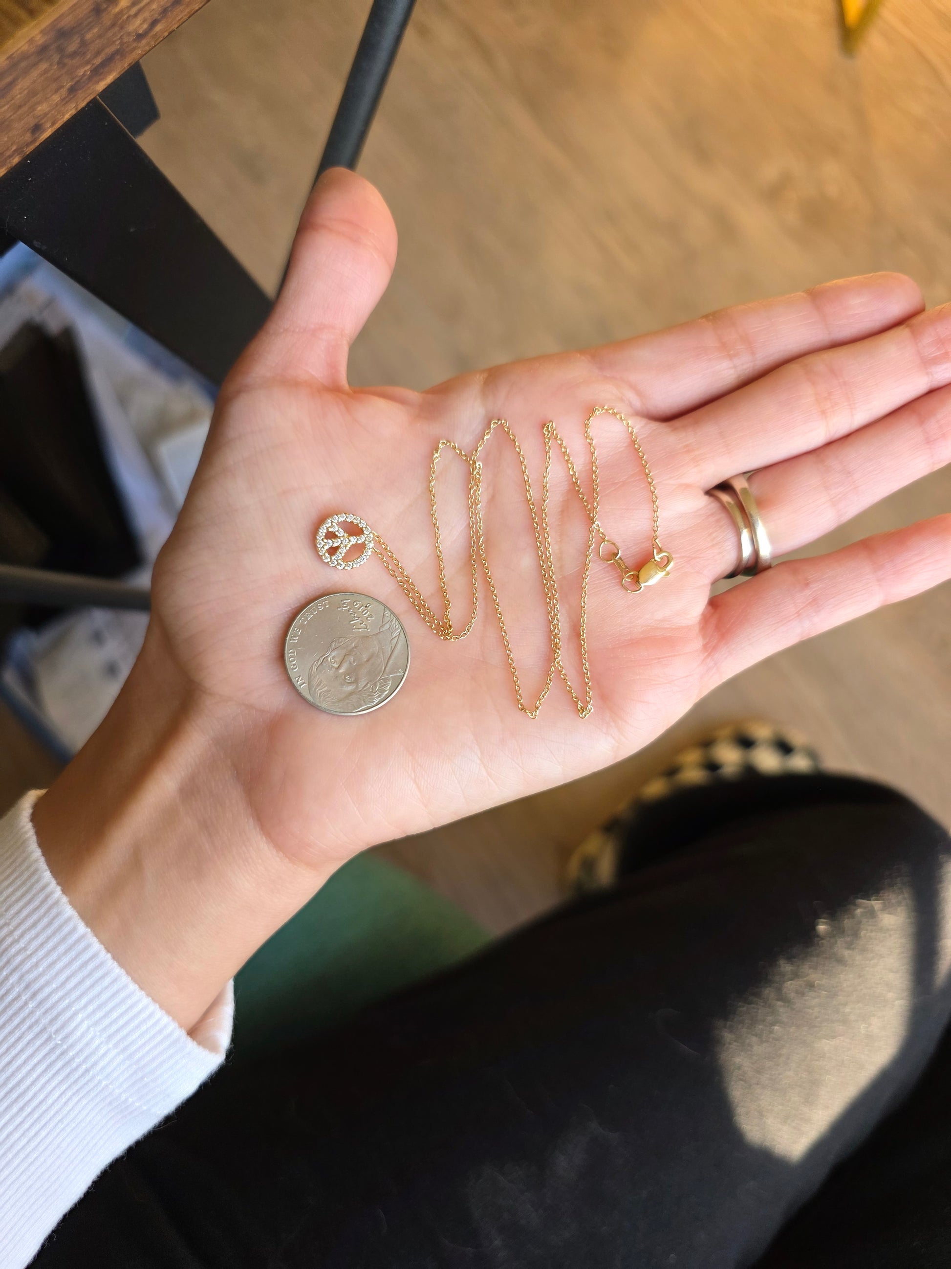 Beautiful Sparkling Diamond Peace Symbol 14k Gold Necklace 17"